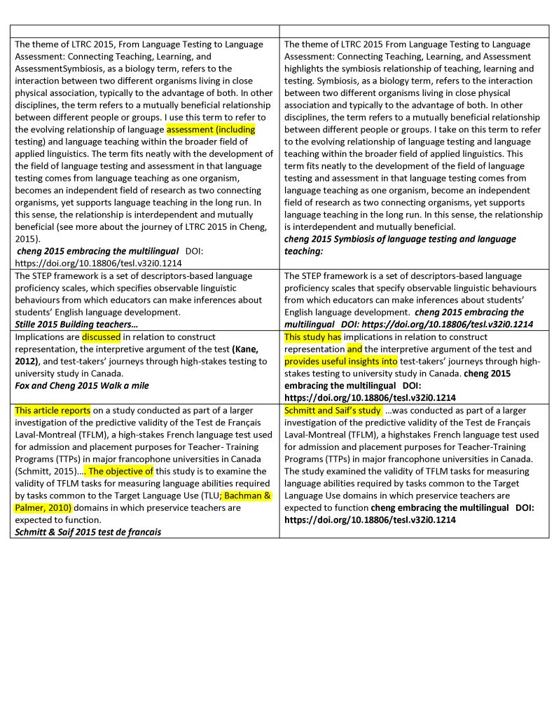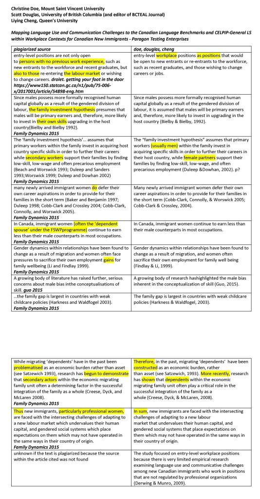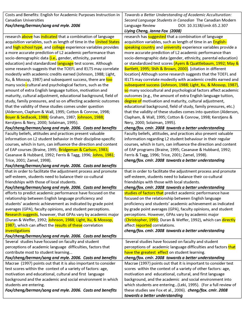 As guest editor for a special issue of TESL Canada Journal , Cheng copies and pastes abstracts from the issue’s articles into her introduction. She also copies parts of the introduction and pastes them into an article in a different journal, or vice versa. Note that the citations in the original article from other authors are not included in Cheng’s copy. This patch writing is common in her work.